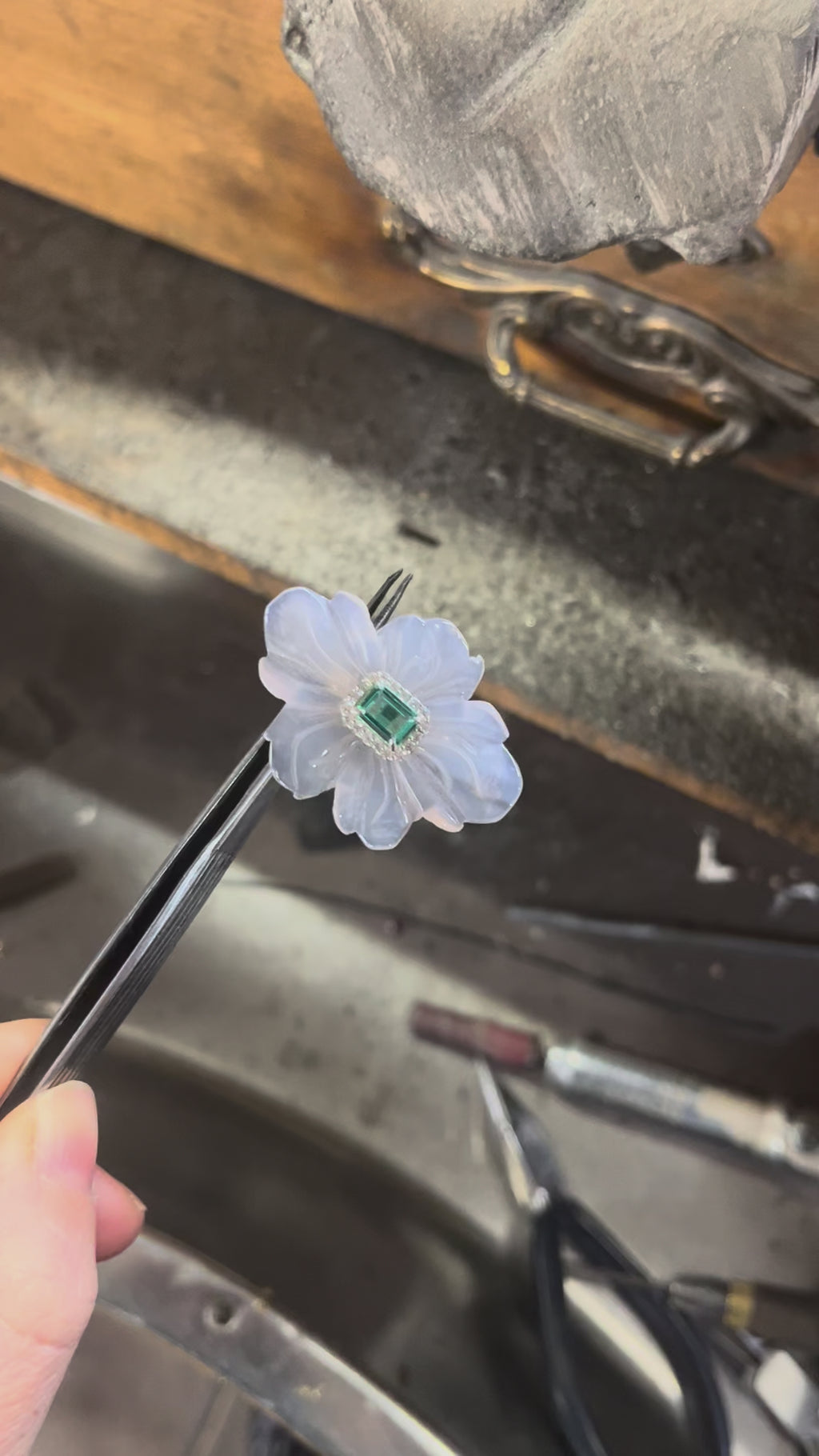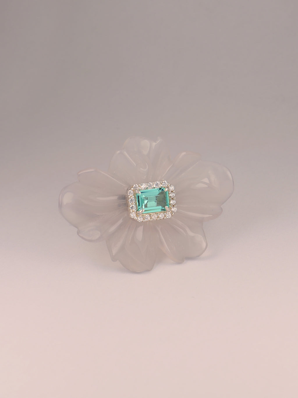 Anillo de plata de ley, flor tallada a mano en ágata gris natural y cuarzo hidrotermal paraiba talla octogonal con orla de espinela blanca.