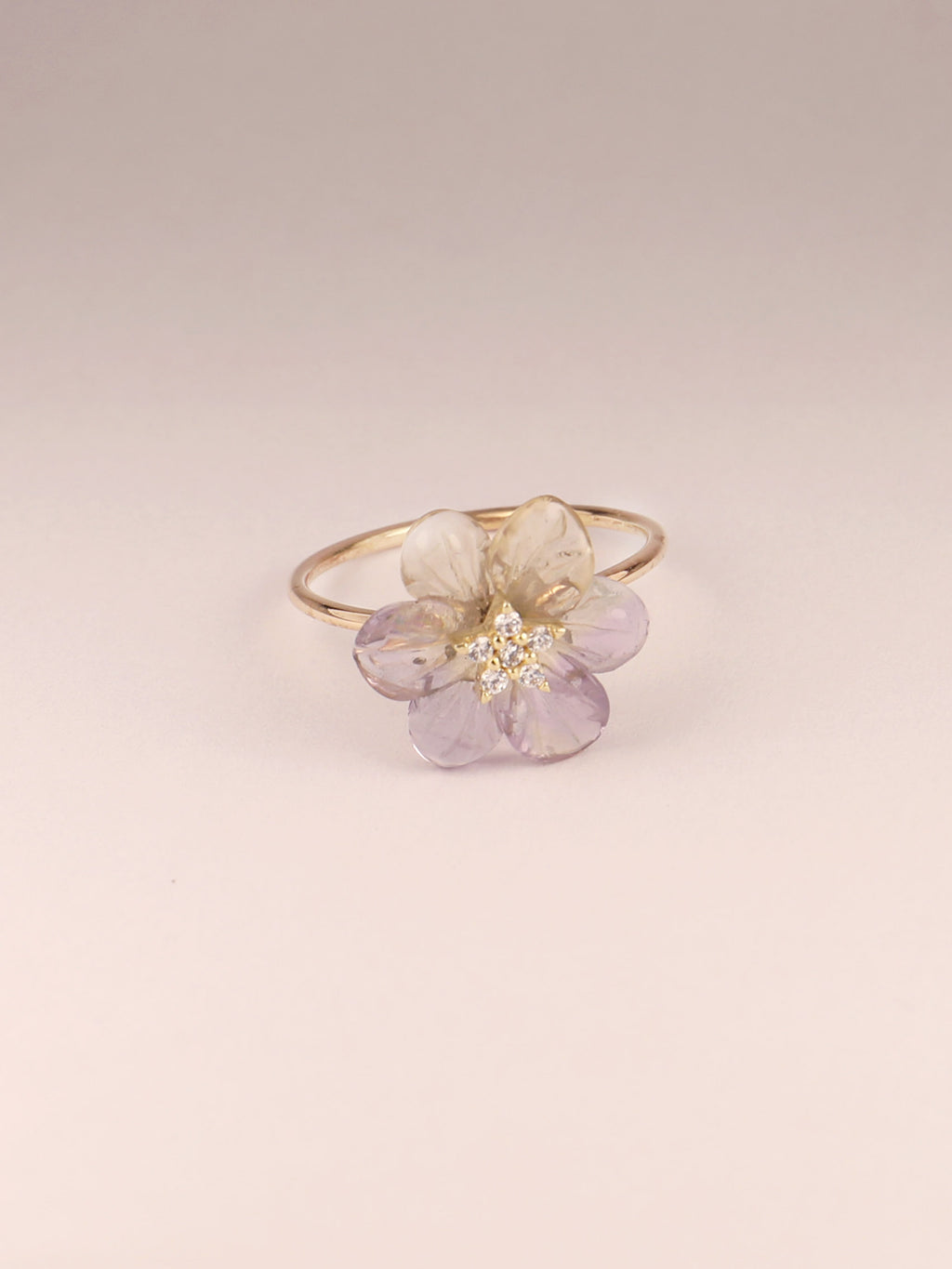 Un anillo especial fabricado en oro amarillo macizo con una flor tallada en ametrina natural y una estrella cuajada de espinela blanca en el centro.