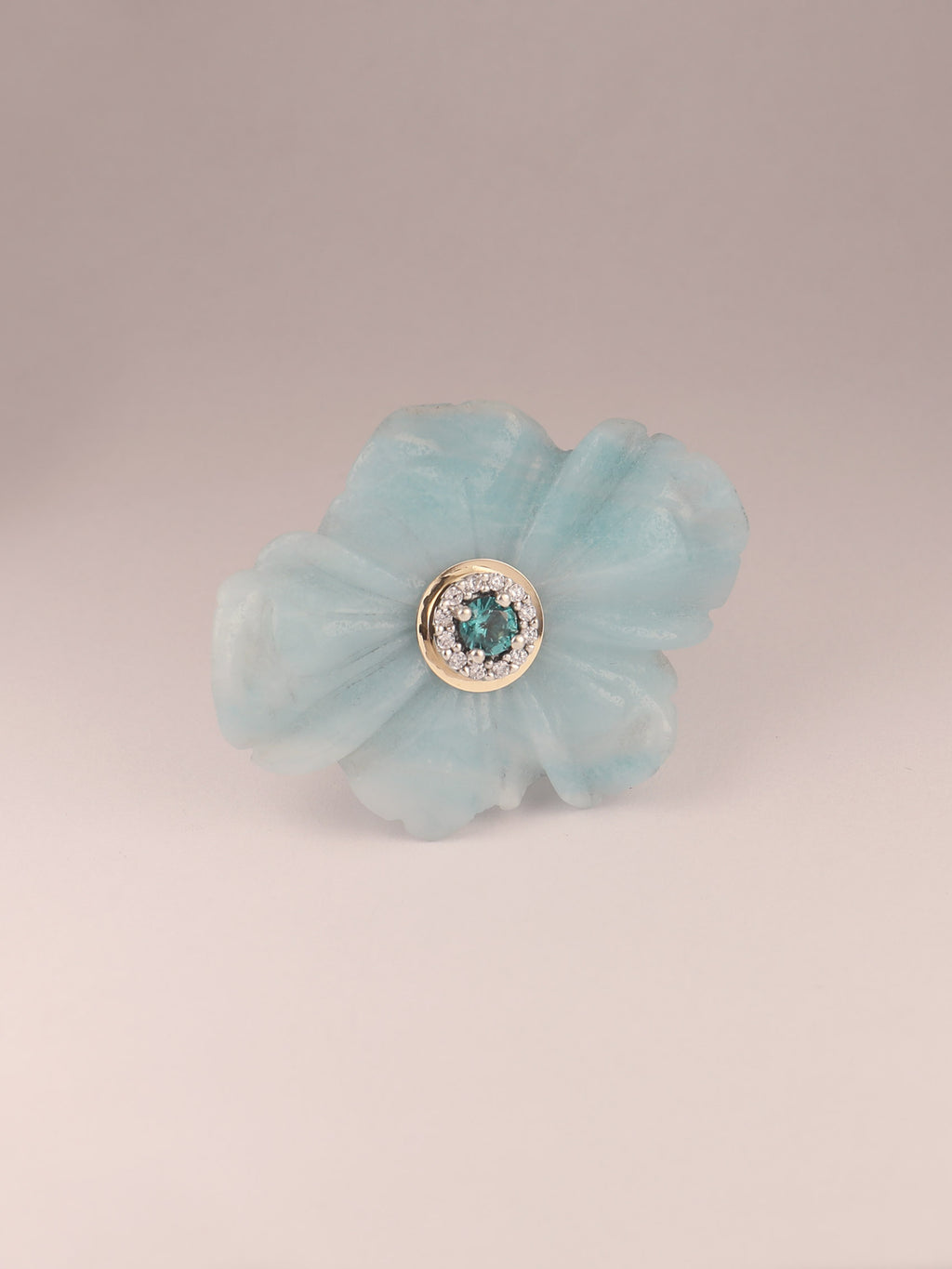 Anillo de plata de ley, flor tallada a mano en amazonita natural. Centro de plata de ley con bisel de oro macizo y cuarzo hidrotermal paraiba con orla de espinela blanca.