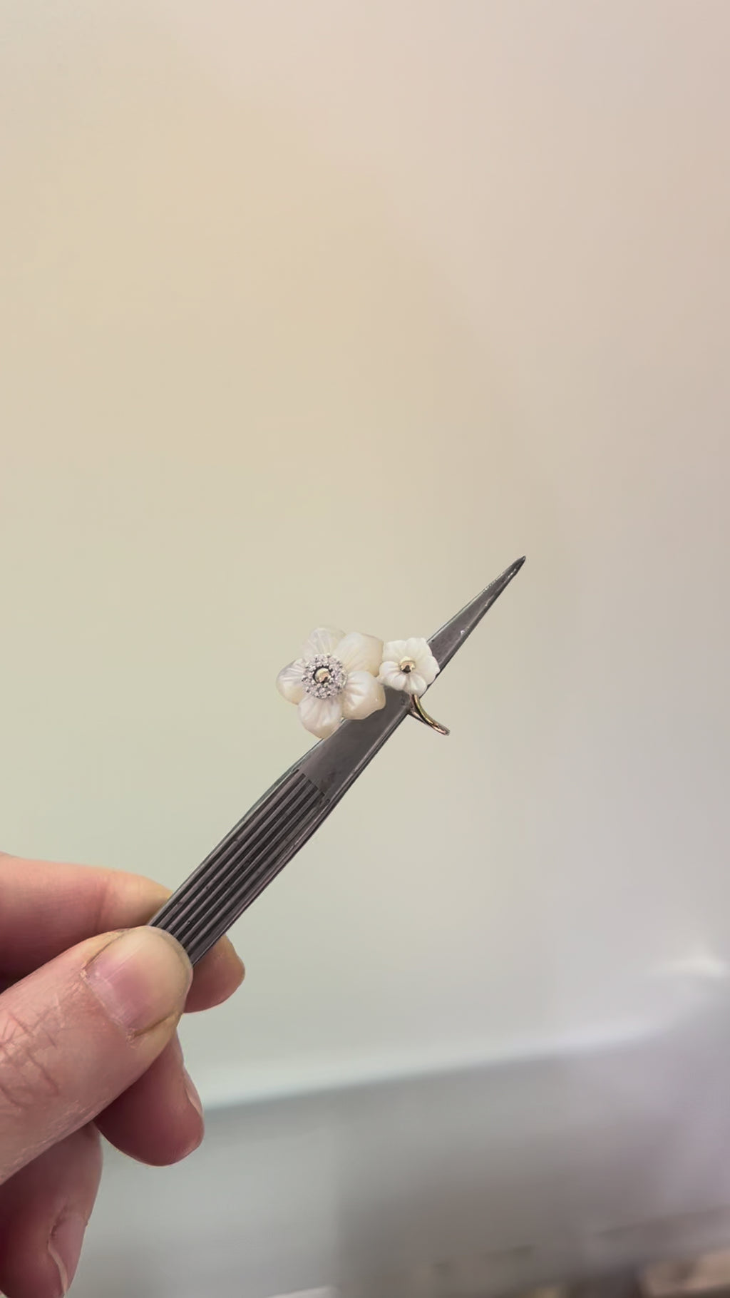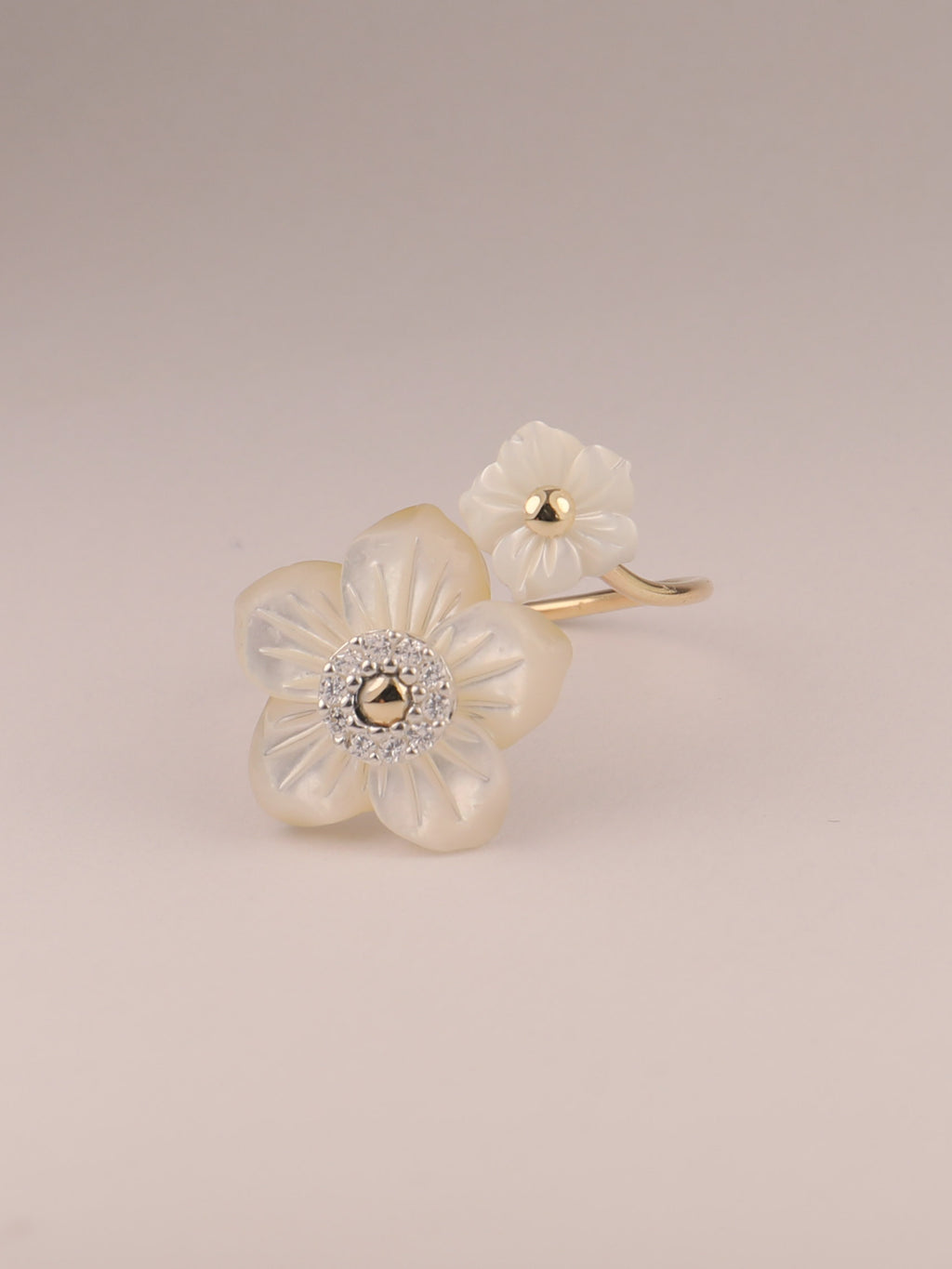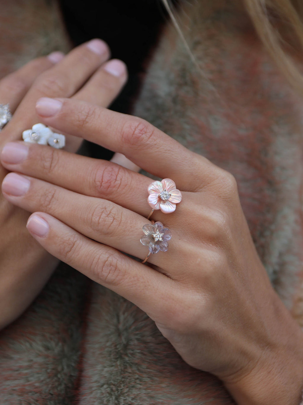 Una nueva versión del anillo Rachel en oro amarillo macizo, flor de nácar rosa natural y espinela blanca.