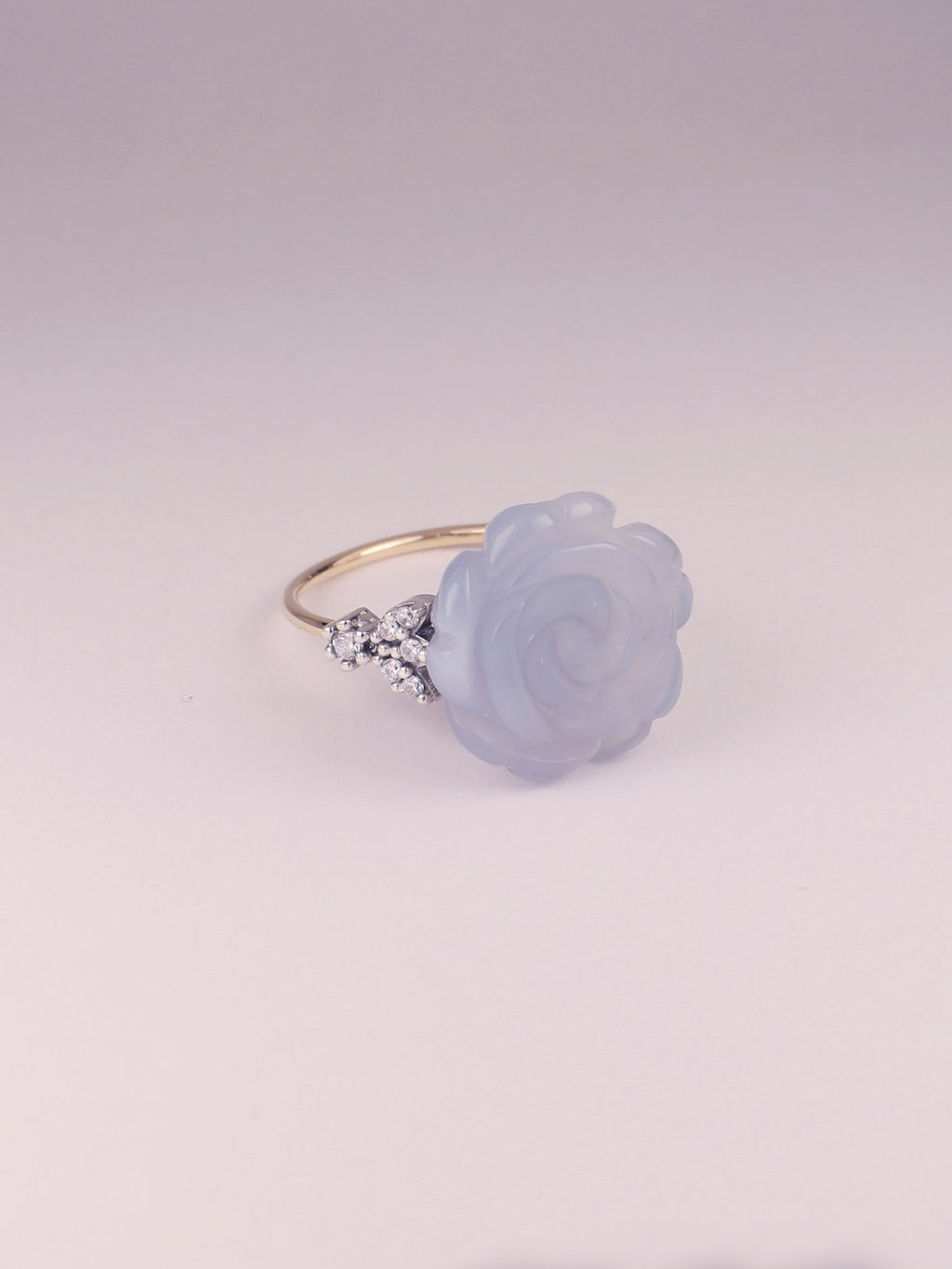 Anillo de plata de ley con rosa de calcedonia natural tallada a mano. Brazo de oro macizo y detalles en forma de hojas en plata de ley cuajada de espinela blanca.